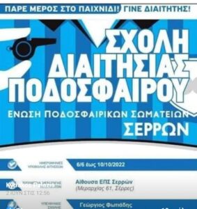 ΓΙΝΕ ΔΙΑΙΤΗΤΗΣ – ΠΑΡΕ ΜΕΡΟΣ ΣΤΟ ΠΑΙΧΝΙΔΙ Από την Επιτροπή Διαιτησίας της Ε.Π.Σ.Σερρών ανακοινώνεται ότι θα λειτουργήσει σχολή διαιτησίας τον Οκτώβριο για την ανάδειξη νέων διαιτητών. Η σχολή διαιτησίας είναι δωρεάν και δικαίωμα να καταθέσουν αίτηση έχουν οι νέοι και νέες από 16 έως 30 ετών. Υπεύθυνος σχολής είναι ο…