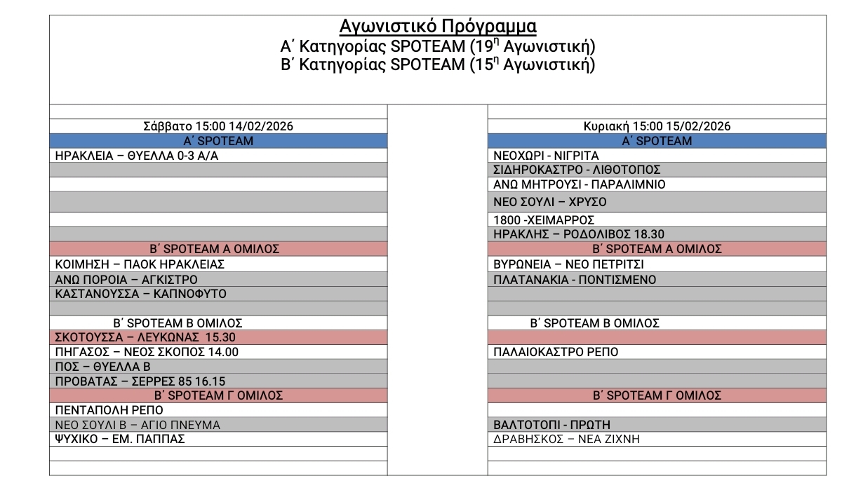 Πρόγραμμα αγώνων ΕΠΣ Σερρών 14-15/02