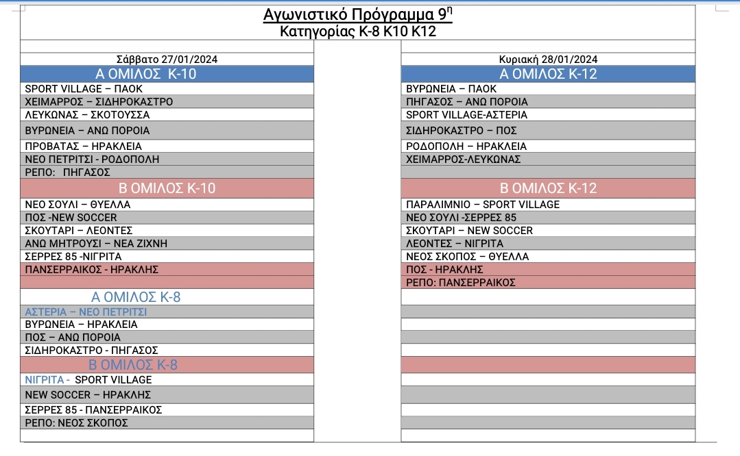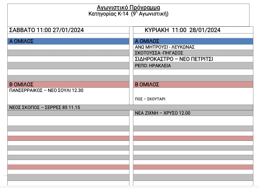 Πρόγραμμα αγώνων πρωταθλημάτων υποδομών 27-28/01